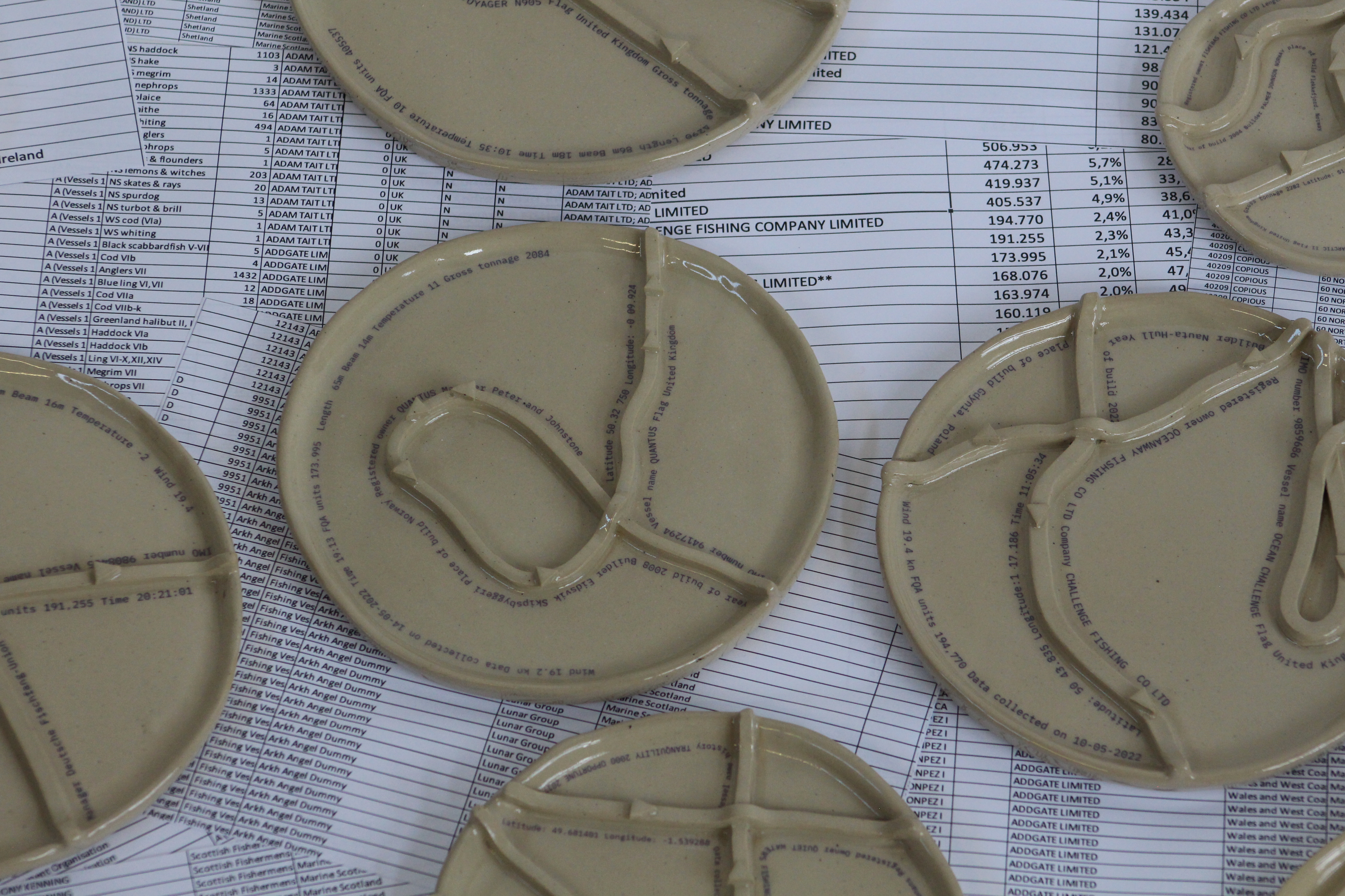 This set up focus and highlights the dissection of ownership by presenting the documents that disclose this information. The work presents a landscape divided by data, where only 25 fishing companies own and control over 80% of the North Sea, through access to crucial fishing quota licences. Leaked Greenpeace data, 25 ceramic plates and videos from my research trips out at sea, expose these companies and reveal the true reality of who owns the sea.