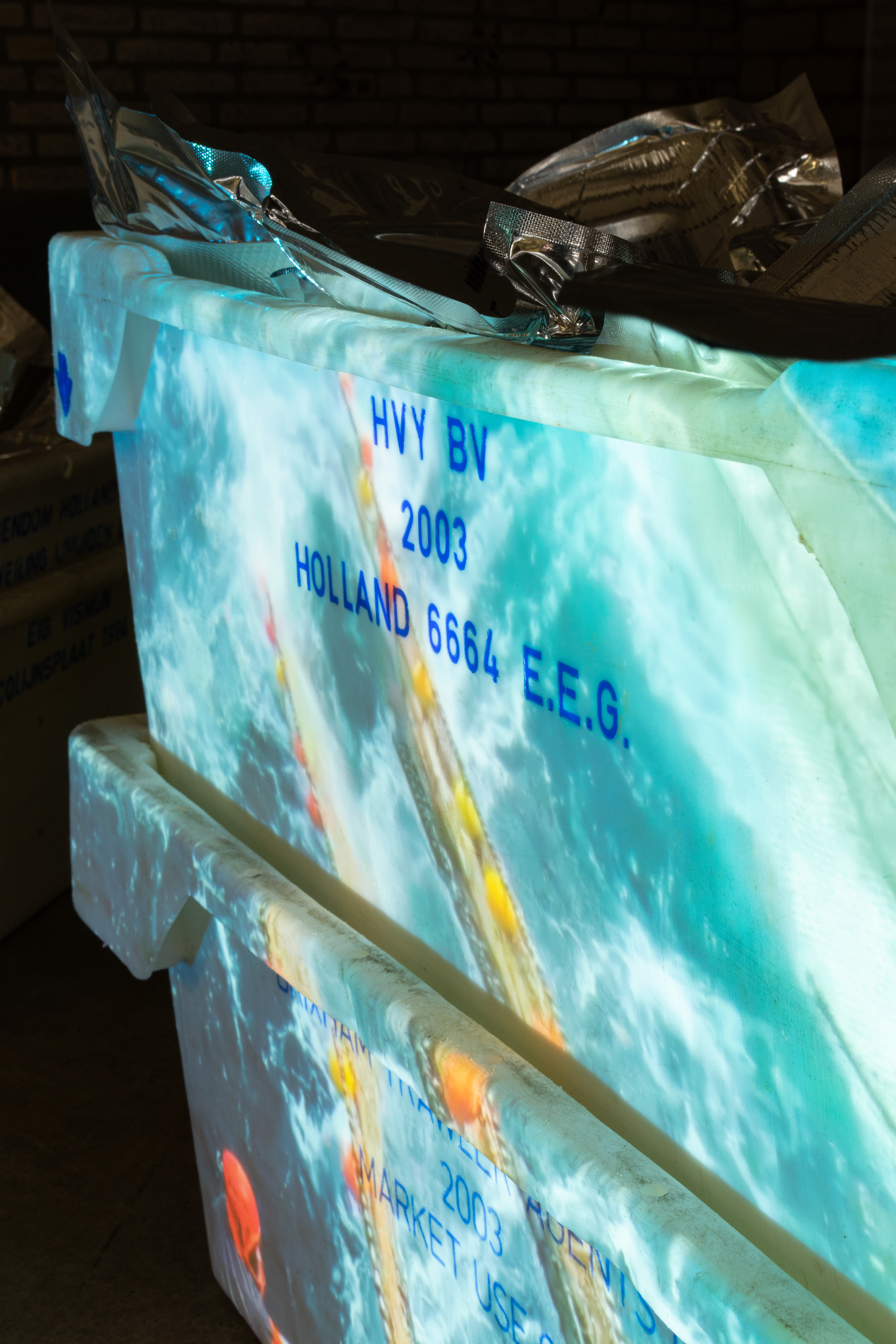 Form, video installation, a real microchipped mackerel, trophy podium, fake real plaster fish, fish crates, receipt of transparency